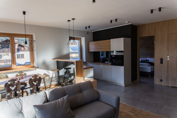 Die vollausgestattete Wohnung Olympia im 1. Stock der Lodge bietet einen großartigen Blick auf Alpspitze und Zugspitze, welchen Sie vom eigenen Sonnenbalkon genießen können. Von der Lesebank am Fenster können Sie die den Ausblick auch auf den Kramer genießen. Unsere Wohnung Olympia gehört zu den schönsten Ferienwohnungen in Garmisch - überzeugen Sie sich selbst! Die Wohnung bietet ausreichend Platz für 2 Personen, gerne auch mit Kindern.